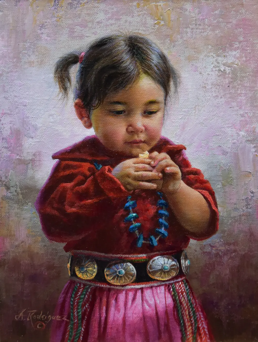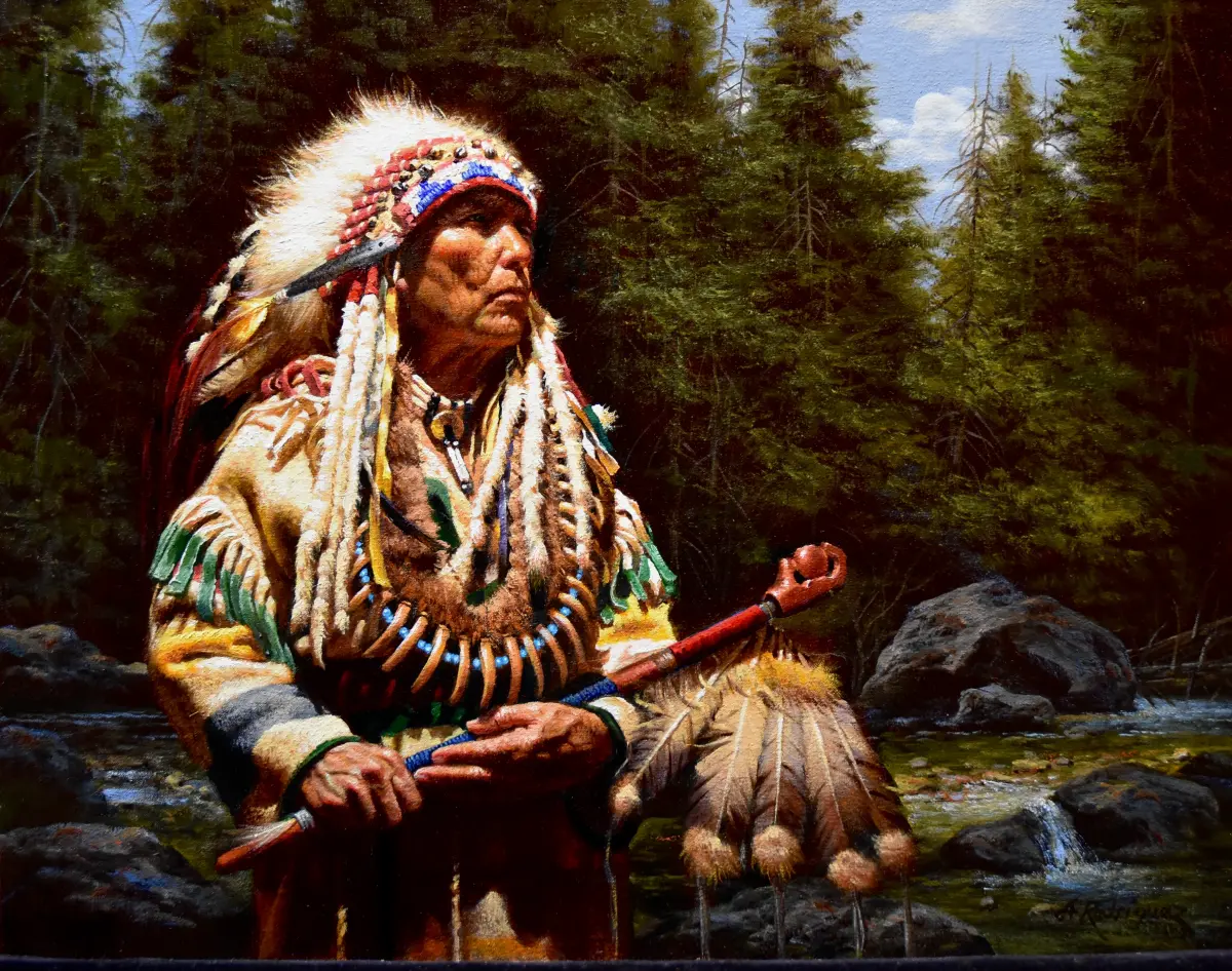 Available Native American Paintings "She Stands In Beauty" Oil on Linen 30” x 24”$14,500 "Chief With Eagle Claw Pipe" Oil on Linen. 14” x 18”$9,500 "Navajo Cookie" Oil on linen/panel 12” x 9”$4,500 “NAVAJO KIDS” Oil on Linen 16” x 12"Price $5,800 This painting will be available for sale at the “Night of Artists” Art Show at the Briscoe Museum, San Antonio Texas, the last week of March, 2025. “COUNTING HER BLESSINGS” Oil on Linen 12” x 9"Price $4,500 ”HOLDING THE EAGLE CLAW PIPE” Oil 24” x 30"Price $14,500 "Surrounded by Silence" Oil 40” x 30"Price $24,000 Please write to Alfredo Rodriguez for new images and information about the paintings for upcoming shows. Also follow me at Thank you Alfredo